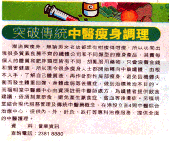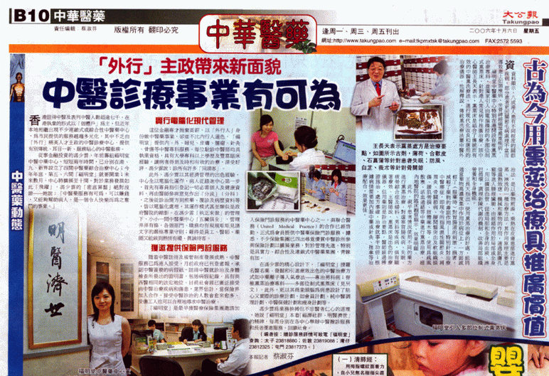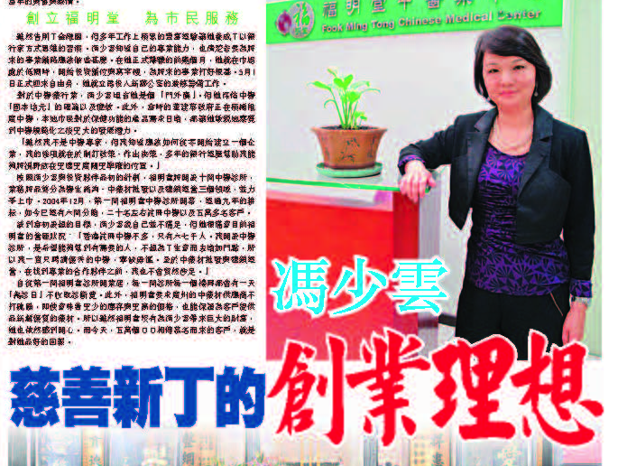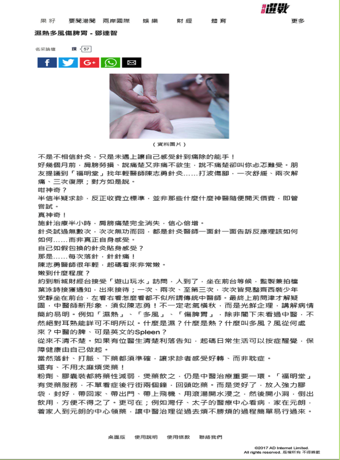 媒體報道 BULLETIN 工商月刊 02-2024 社會福利署講座「內經四氣調神大論篇的四時養生」22-08-2019 MONEY 智富 16-02-2019 健康動力5月號 05-2017 蘋果日報「濕熱多風傷脾胃-鄧達智」23-03-2017 香港職業發展服務處「職訊」10-2016 商業電台「優質生活之捱夜睇波小貼士」09-06-2014 健康動力6月號 06-2014 健康動力8月號 08-2013 東華三院總理馮少雲實現時裝夢 24-05-2013 商業電台「醫療解密之頸源痛」23-05-2013 馮少雲慈善新丁的創業理想 16-05-2013 加入東華三院 初踏慈善公益義務 16-05-2013 授人以魚不如授人以漁 16-05-2013 助年青時裝設計師實現理想 16-05-2013 商業電台「醫療解密之少年口氣」17-01-2013 商業電台「醫療解密之少年白髮」10-01-2013 更健康雜誌 12月號 12-2011 有線電視健康生活台醫療保健節目-夏日養生有妙法 08-06-2011 兒童尖子教育 10月號 10-2010 U Magazine 27-08-2010 健康動力 12月號 12-2009 中藥醫綠 8 月號 08-2009 太陽報 15-04-2009 香港大學學生會醫學會中醫藥學會「就業講座」13-04-2008 資本伊人12月號 12-2006 成報 12-11-2006 大公報 06-10-2006 Fax Reference Letter 01-07-2006 E-mail Thanks Letter 19-06-2006 東方日報 21-03-2006 香港經濟日報 13-01-2006 東方日報 05-05-2005